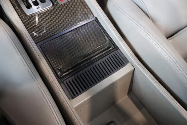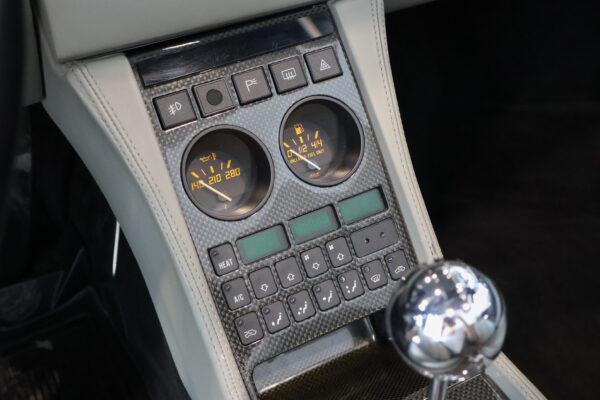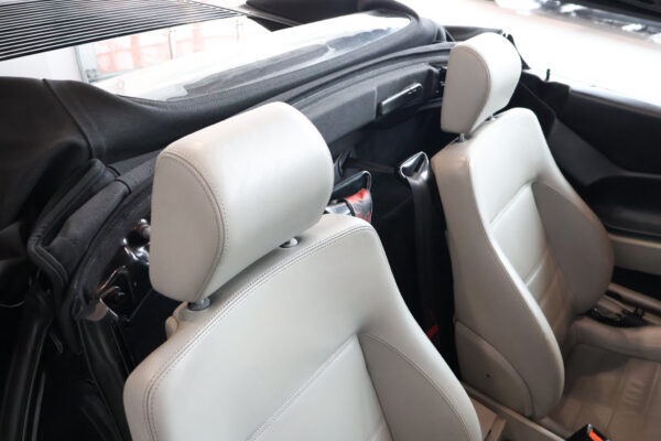 L'intérieur est superbe avec les garnitures en fibre de carbone et le cuir gris clair, tous deux contrastant très joliment avec l'extérieur sombre et la capote du cabriolet